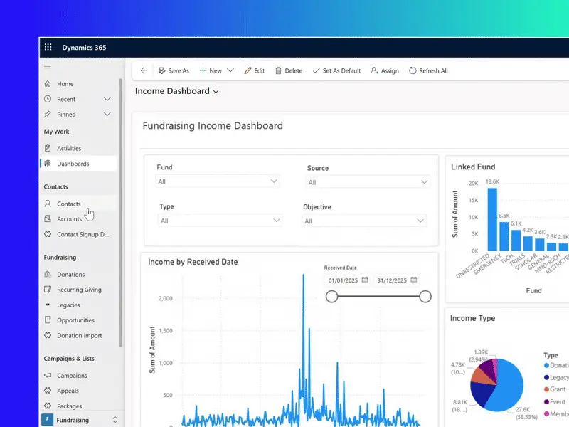 Turn fragmented fundraising into a connected, income-growing system. From identifying unclaimed Gift Aid to a 360° view of all contacts, this is your secure, integrated fundraising-to-finance platform.